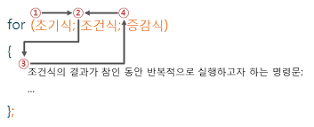 for 문은 초기식, 조건식, 후위식, 반복 코드으로 구분이 되어 초기식 -> 조건식 -> 반복 코드 -> 후위식의 순서대로 진행 되며, 반복하다가 조건식이 false일 때 반복을 멈춥니다.