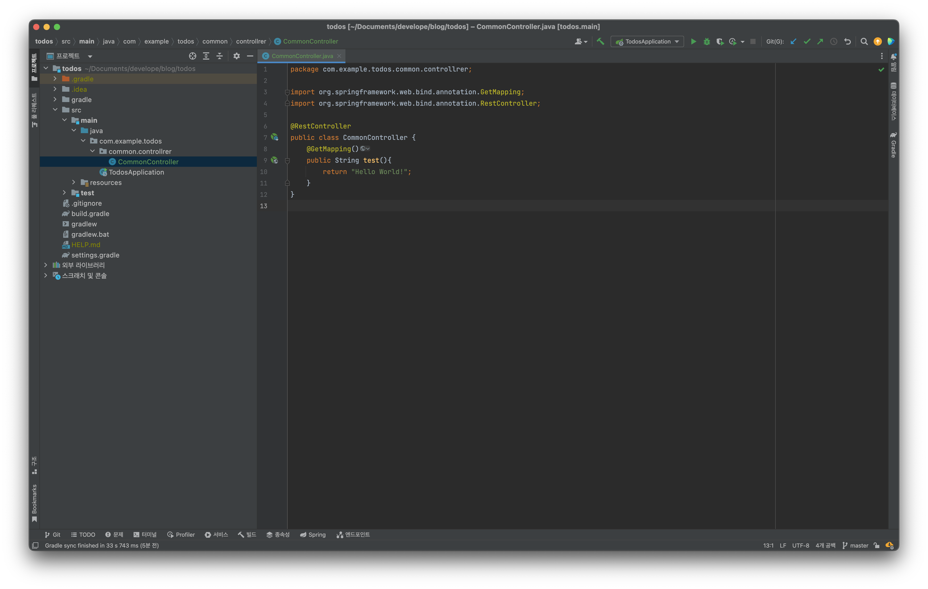 이렇게 나오면 Spring boot Project 생성에 성공한 것이며, 일단 간단하게 Common Package를 만들어 그 안에 Common Controller를 만들어서 테스트를 해보자.