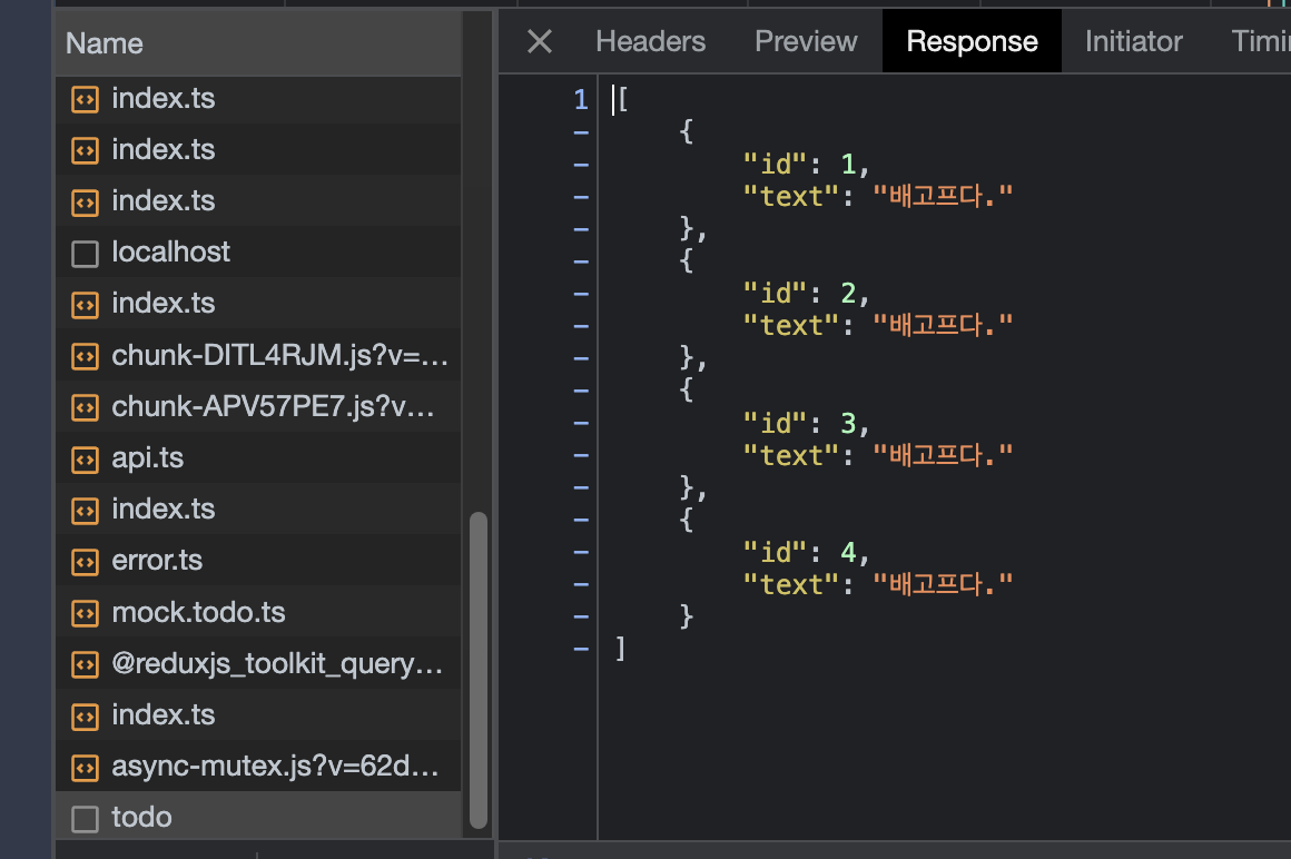 해당 코드를 보면 fetch를 이용하여 백엔드에게 데이터를 요청하여 받아오는 코드인데, 실제 API가 없지만 MSW가 해당 API를 가로채 우리가 앞서 설정한 데이터를 응답으로 넘겨준다.