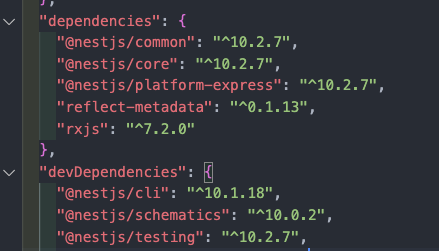자 이제 Package를 V10으로 변경하는 과정은 끝났습니다. package.json 파일에 들어가면 NestJS 관련 패키지들의 버전이 10으로 변경되어있음을 확인이 가능합니다.