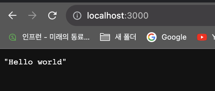 자 이제 Routing Controller에 대한 설정이 끝났다. 이제 브라우저에 localhost:3000으로 들어가면 이렇게 노출되는 것을 확인할 수 있다.