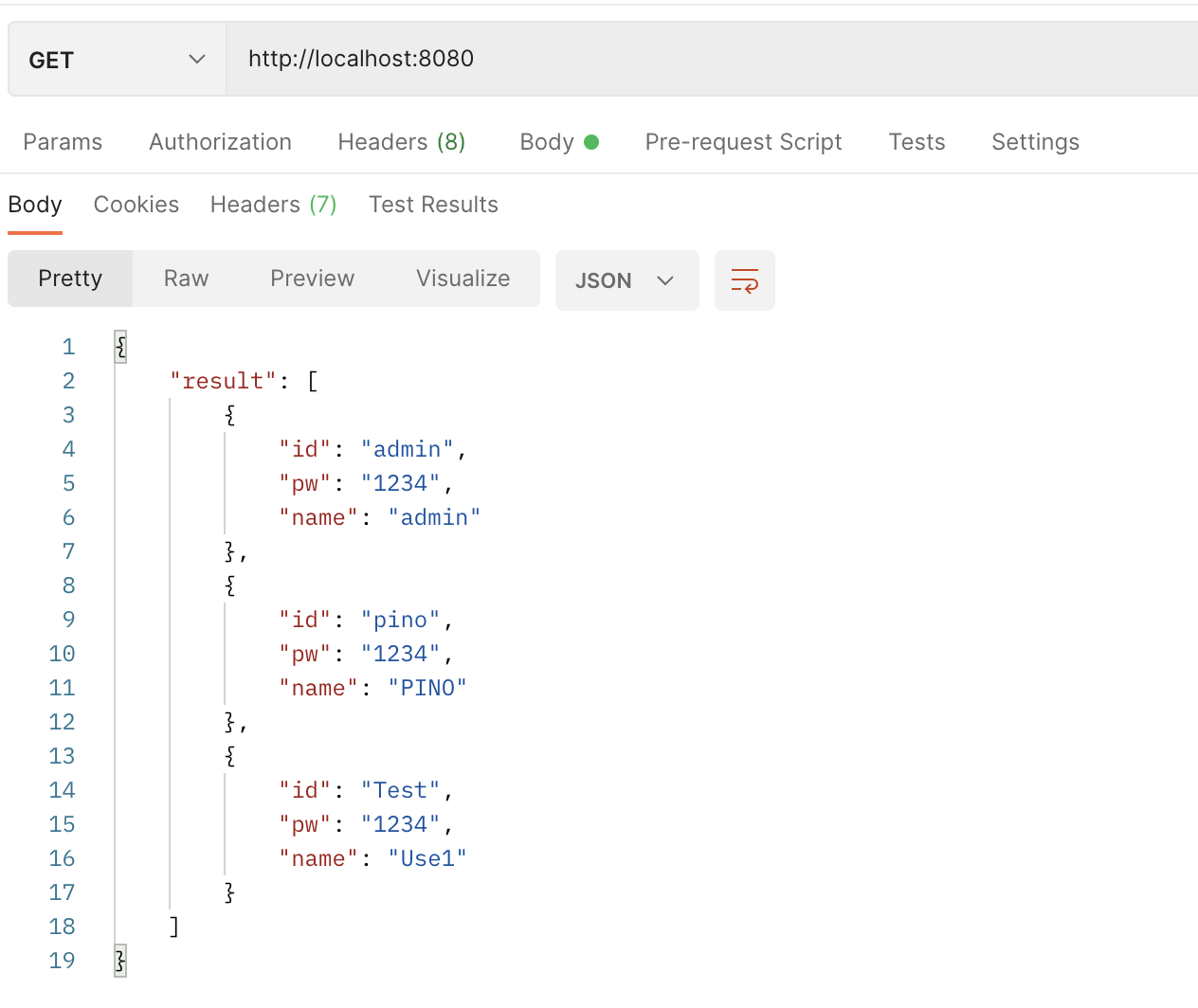 POSTMAN으로 유저를 생성 후, 조회를 해보도록 하자.