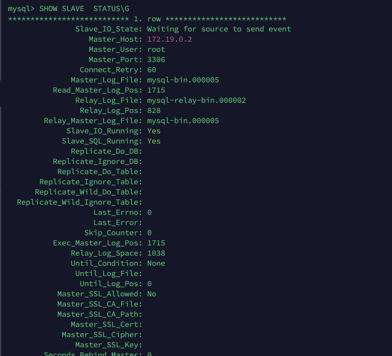 CHANGE MASTER TO MASTER_HOST='172.22.0.2', MASTER_USER='root', MASTER_PASSWORD='password', MASTER_LOG_FILE='mysql-bin.000013', MASTER_LOG_POS=0, GET_MASTER_PUBLIC_KEY=1;