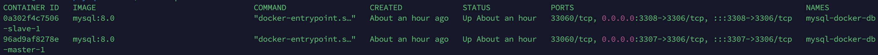 나는 port를 각 3307과 3308를 사용하지만 개인이 편한대로 포트와 username 등을 조절하여 사용하면 된다. 자 이제 구성이 다 되었으니 docker-compose를 실행시키고 내부에 접속하여 구성을 해야한다.