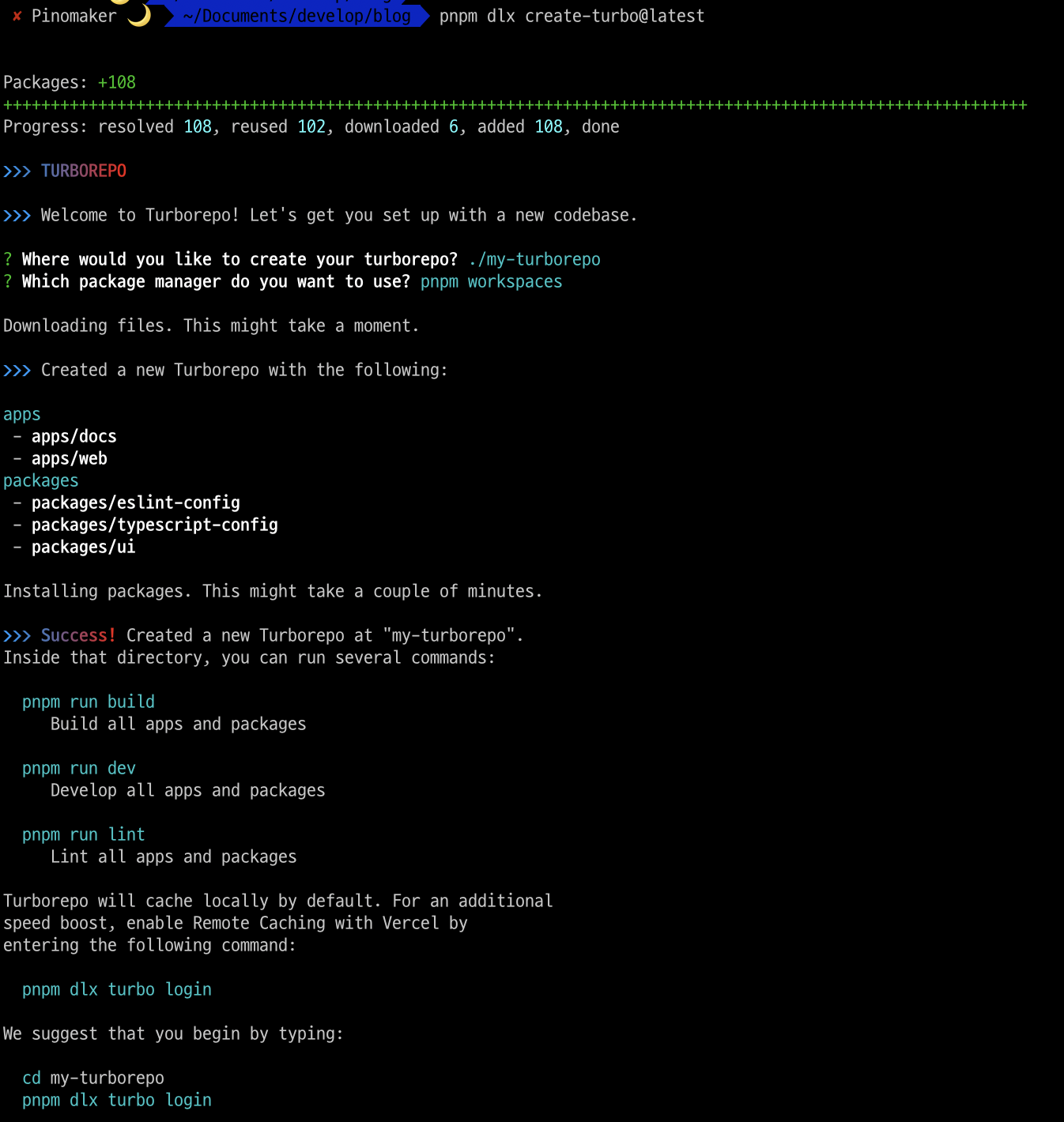 아래의 명령어를 터미널에 입력하면, 프로젝트의 이름을 입력하고, 패키지 관리자로 사용할 것을 선택하면 Turborepo의 프로젝트가 생성 됩니다.