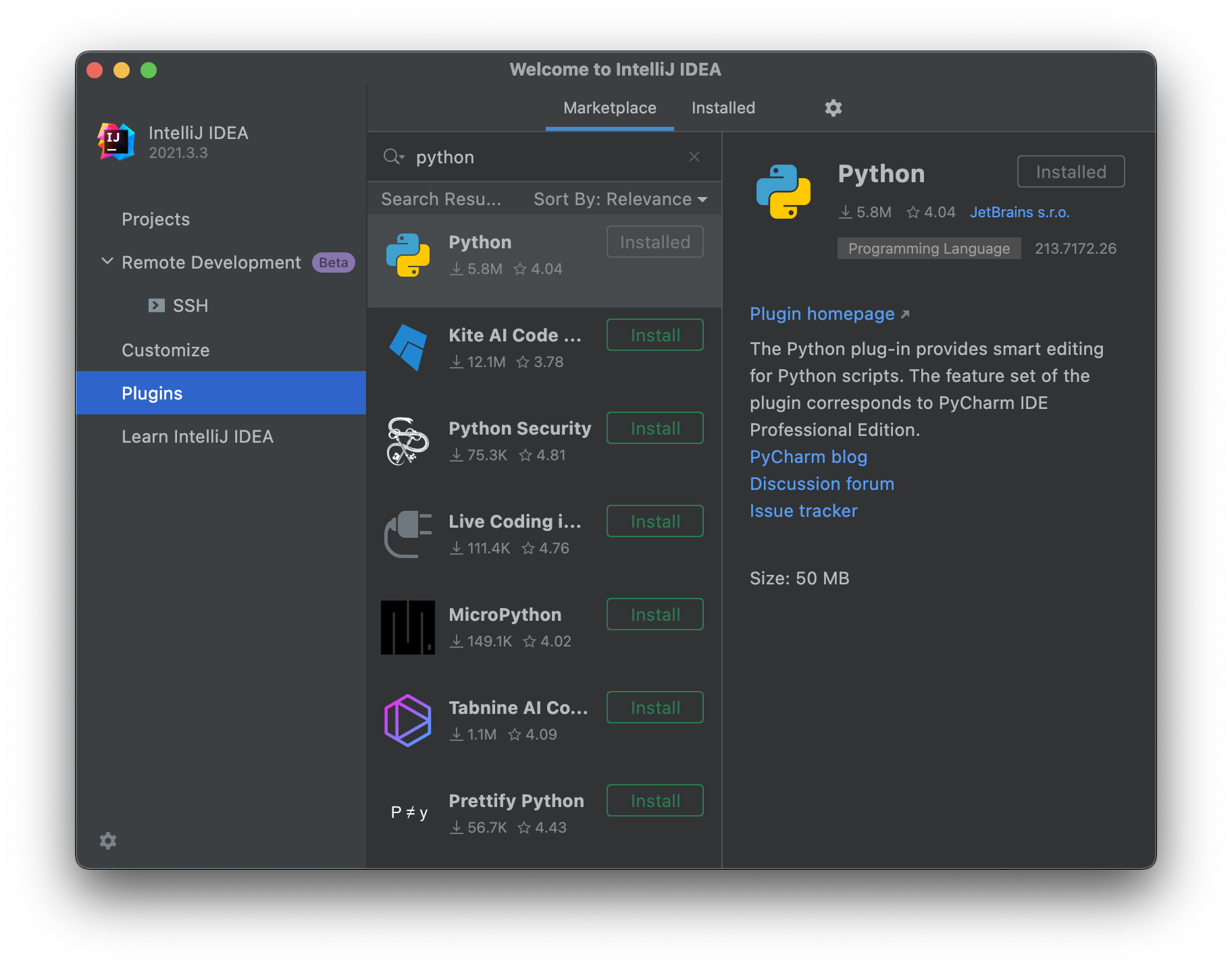 IntelliJ를 실행 후 Plugin에서 Python을 설치한다.