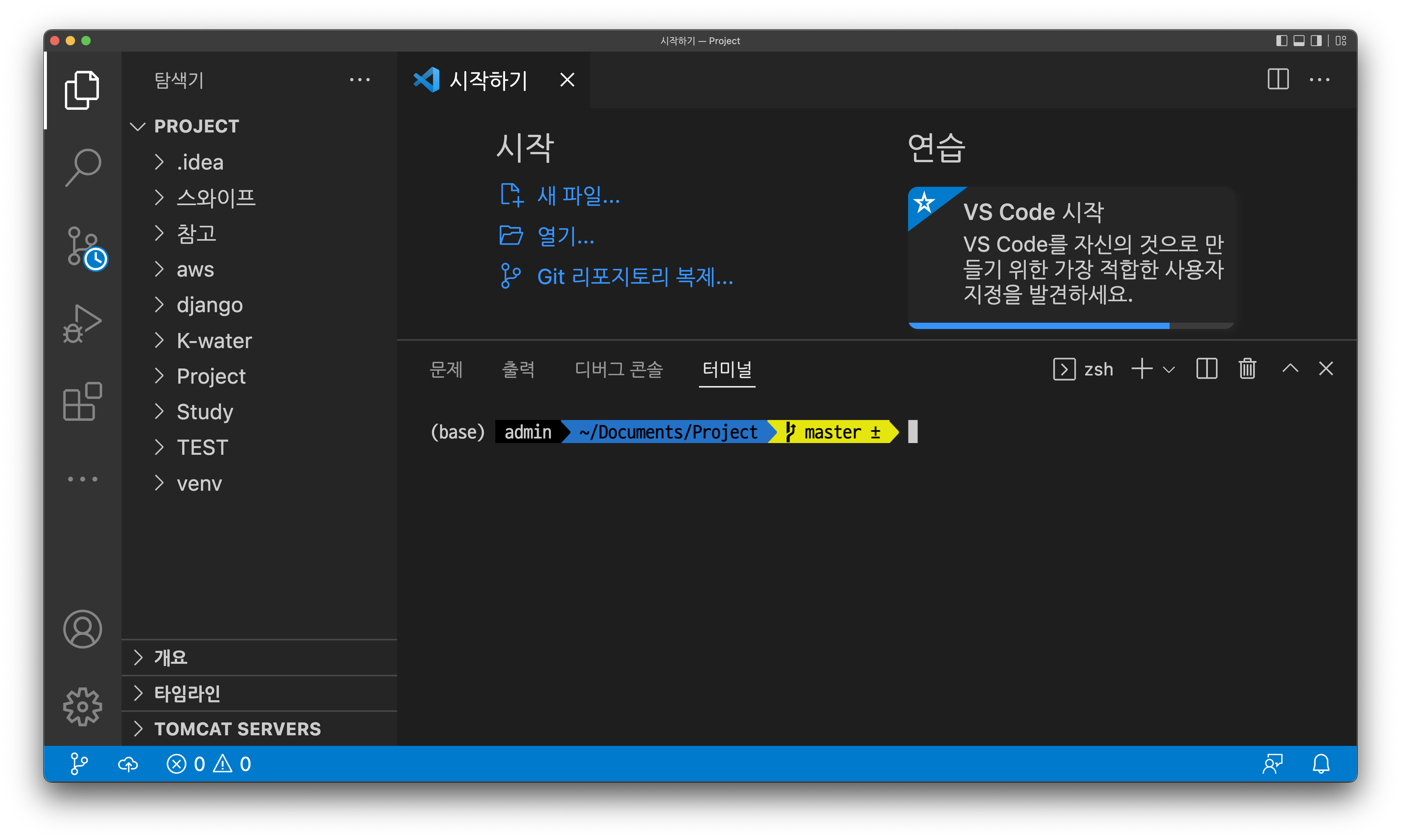 따라서 터미널 명령어를 사용하여 경로 설정을 해주거나, 폴더 열기를 통하여 생성한 test 폴더를 열어서 터미널 경로를 잡아준다.