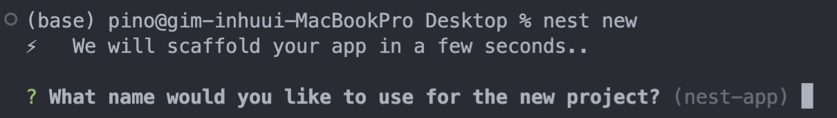 그 후 원하는 경로에서 nest new을 이용하면 NestJS 프로젝트를 생성 할 수 있으며, 순서에 맞게, 프로젝트 이름과 npm, yarn 중 하나를 선택하면 생성이 완료된다.