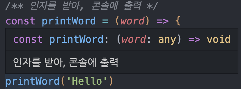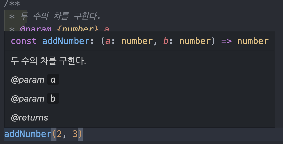 위와 같이 작성하면, 매개 변수의 타입과 해당 함수의 리턴 값의 타입을 지정해줄 수 있고, 마찬가지로, 해당 함수 명에 마우스 포인터를 올리면 아래의 이미지와 같이 타입을 설명해준다.